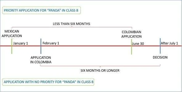 In this example, a Mexican application filed on January 1st that is later filed in Colombia on June 30th, but it claims priority and could defeat a much earlier (February 1st, in this case) application for an identical or likely-to-be confused third party trademark that does not claim priority.