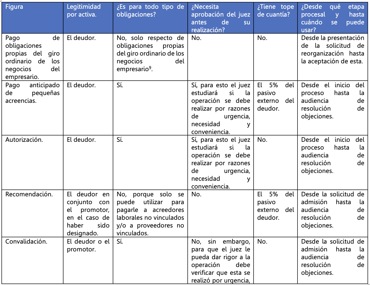 De llevarse a cabo estas prohibiciones, el juez del concurso a petición de parte o de oficio puede imponer sanciones hacia el concursado, sus administradores y/o acreedores, las cuales dependiendo de la etapa procesal en la que se cometan, pueden consistir en la remoción de los administradores[1], el pago de multas, la postergación de créditos y/o la ineficacia de pleno derecho. No obstante, existen ciertas figuras que actúan como excepciones a las restricciones contempladas en el artículo 17, y que a su vez evitan la imposición de las sanciones mencionadas. Dichas figuras son: (i) pago de obligaciones propias del giro ordinario de los negocios del empresario[2]; (ii) pago anticipado de pequeñas acreencias[3]; (iii) autorización[4]; (iv) recomendación[5] [6]; y (v) convalidación[7].