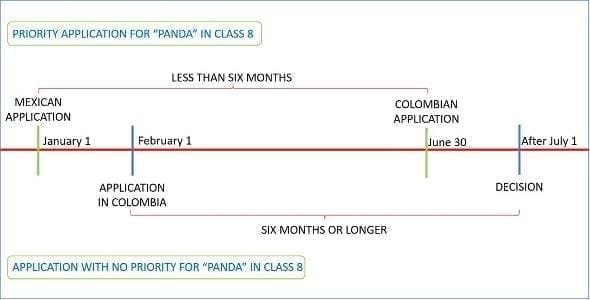 In this example, a Mexican application filed on January 1st that is later filed in Colombia on June 30th, but it claims priority and could defeat a much earlier (February 1st, in this case) application for an identical or likely-to-be confused third party trademark that does not claim priority.